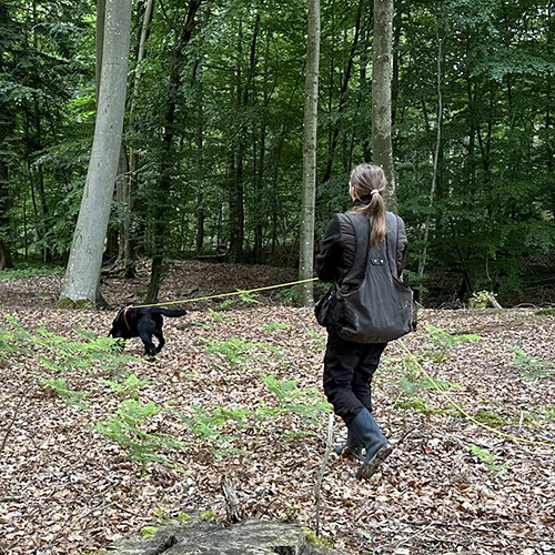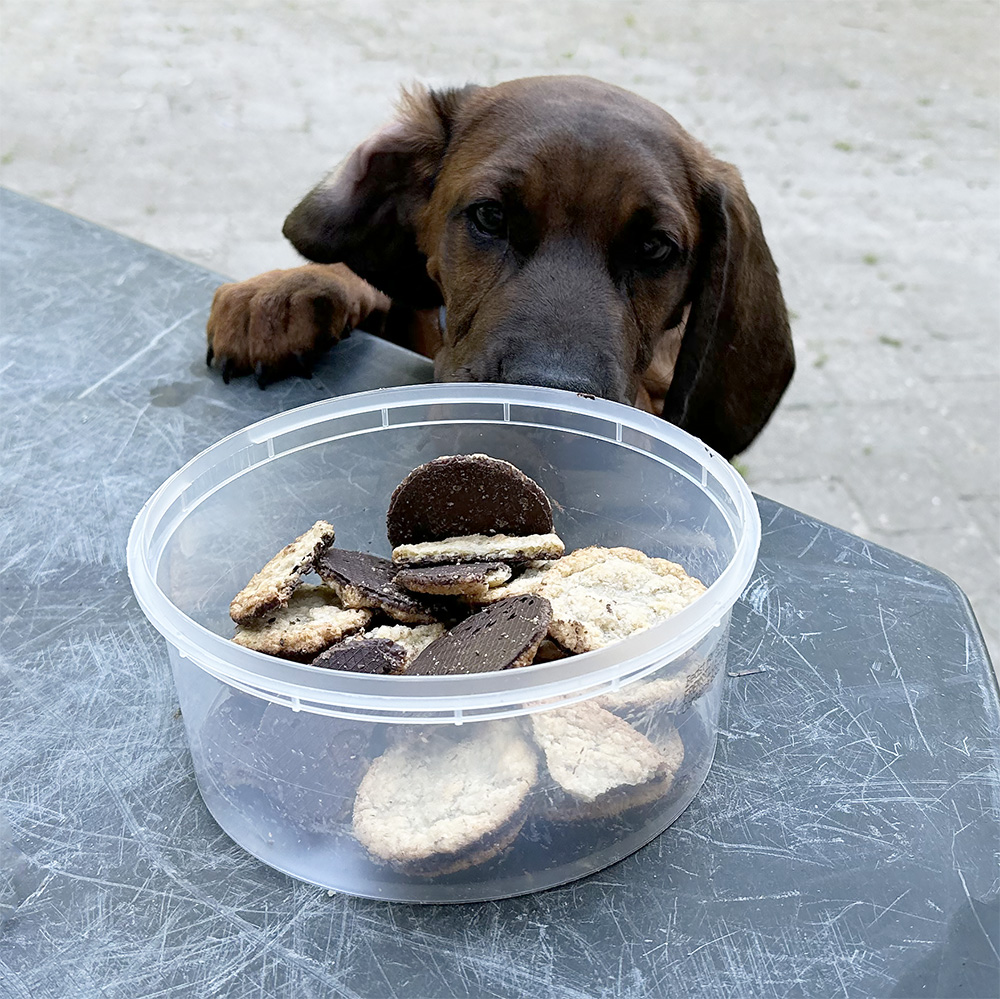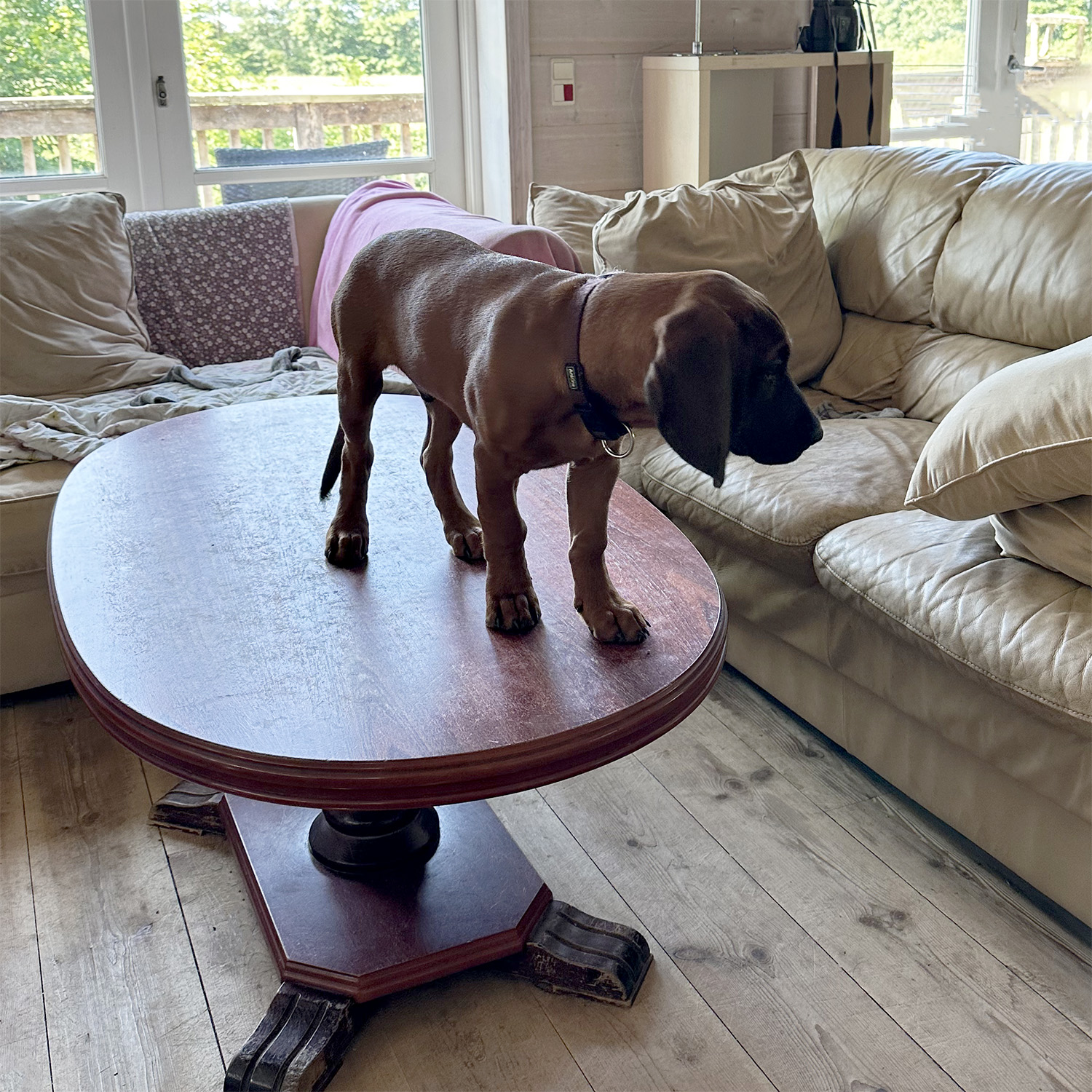 Alle mine egne hunde jeg har trænet i spor- og schweissarbejdet, har som hvalpe/unghunde hverken kunnet gå pænt i line, sidde eller dække på kommando. Hvis jeg ikke havde noget at lokke med, var det ikke altid de kom når jeg kaldte på dem.