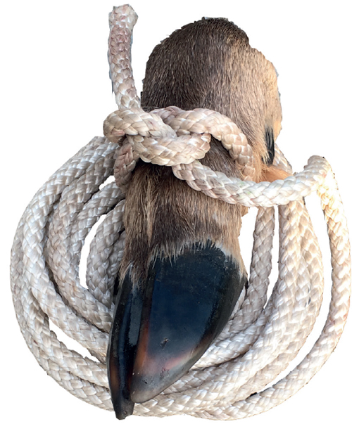 - En klov fra hjortevildt påsat en ca. 2 meter lang snor.