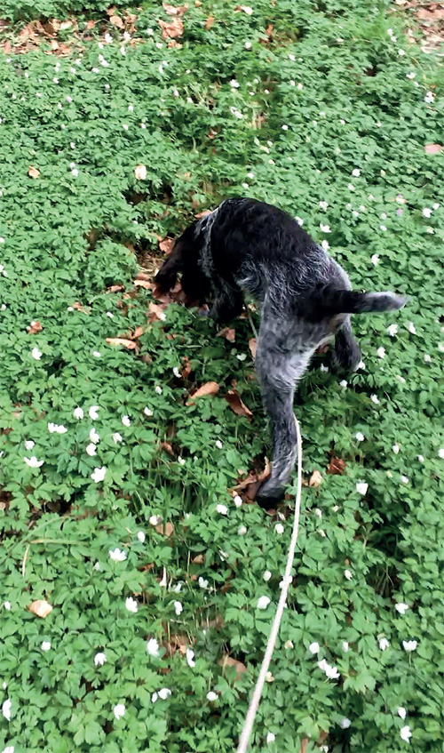 Efter nogle få spor har hvalpen fundet ud af, at den ikke bare kan spurte derud af men er tvunget til hele tiden at korrigere for at kunne følge sporet.