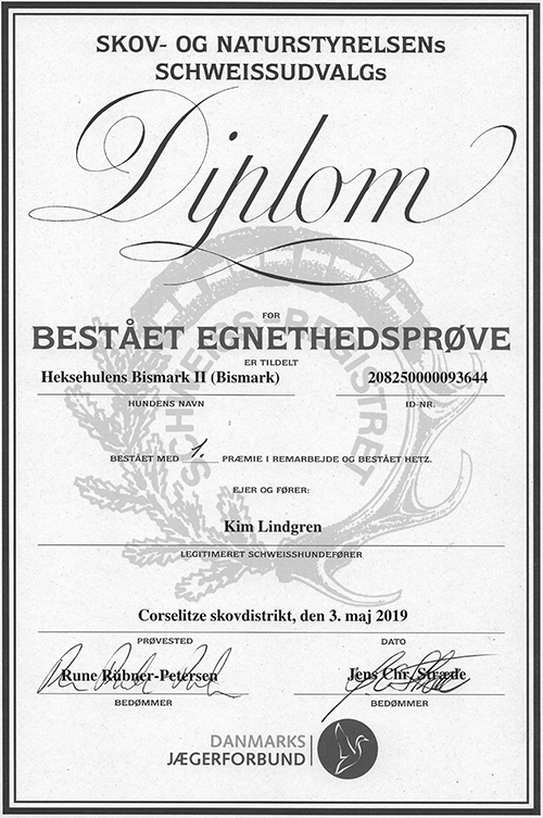 Min unge gennemarbejdede og sporlydige unghund, blev efter denne præstation godkendt som reg. schweisshund.