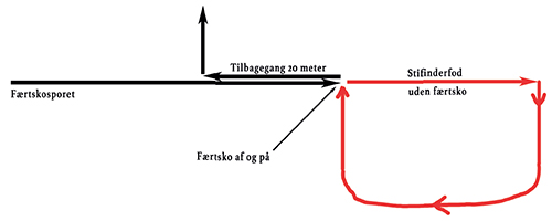 Herefter fortsætter jeg 10-30 meter frem (afhængig af hvor lang en tilbagegang jeg vil lave), og markerer tydeligt, hvor jeg tager færtskoene af, og lader dem blive stående i skovbunden. Da jeg nu skal lave stifinderfoden, fortsætter jeg mindst 50 meter lige frem og slår en stor bue ud til en af siderne.